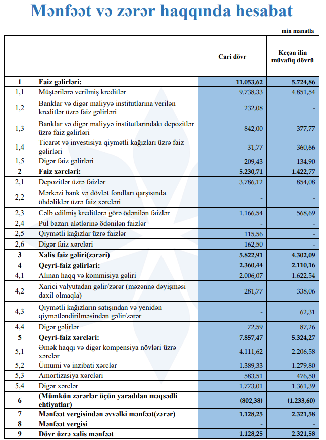 Beləliklə, təqdim olunan maliyyə göstəriciləri göstərir ki, bank balans və fəaliyyət həcmi baxımından genişlənmə mərhələsindədir. Aktivlərin, kredit portfelinin və depozitlərin artımı bankın bazar mövqeyinin möhkəmləndiyini göstərsə də, gələcək dövrdə əsas diqqət istiqamətlərindən biri əməliyyat xərclərinin optimallaşdırılması və rentabelliyin artırılması olacaq. Bu baxımdan, bankın kredit portfelinin keyfiyyətinin qorunması və gəlir strukturunun daha da diversifikasiyası növbəti dövrlərdə maliyyə nəticələrinin yaxşılaşmasında həlledici rol oynaya bilər.