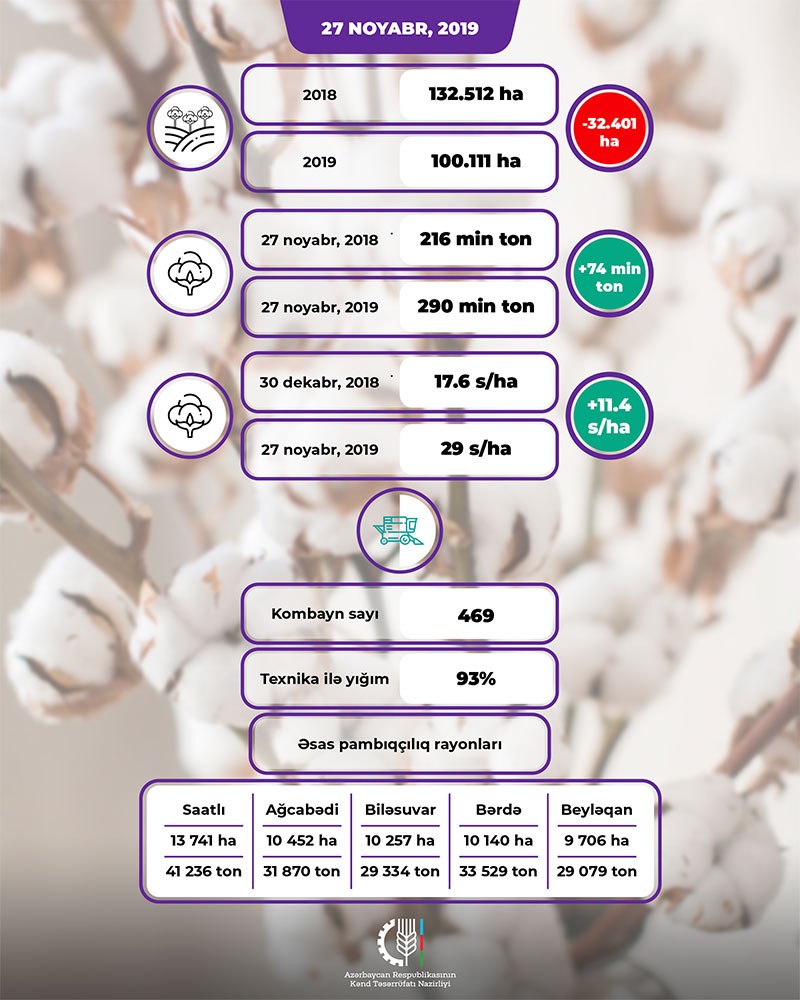 2018-ci ildə Azərbaycanda 132,5 min hektar sahədə pambıq əkilib, 2019-cu ildə isə pambıq əkini sahələrinin həcmi məhsuldarlığı az olan torpaqların əkin dövriyyəsindən çıxarılması hesabına 100,1 min hektaradək azaldılıb. Bu addım pambıqçılıqda orta məhsuldarlığı artırmağa, pambıq əkini dövriyyəsindən çıxarılmış torpaqları daha səmərəli istifadə etməyə imkan verib.