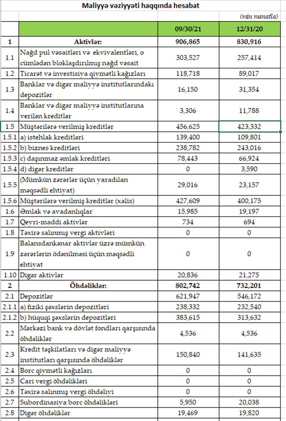 “Rabitə Bank”ın cəmi aktivləri 2021-ci ilin 9 ayında ötən ilin sonu ilə müqayisədə 75 milyon 949 min manat və ya 9,1 % artaraq 906 milyob 865 min manata çatıb. Bank 2020-ci ilin sonunda 830 milyon 916 min manat cəmi aktivlərə malik idi.