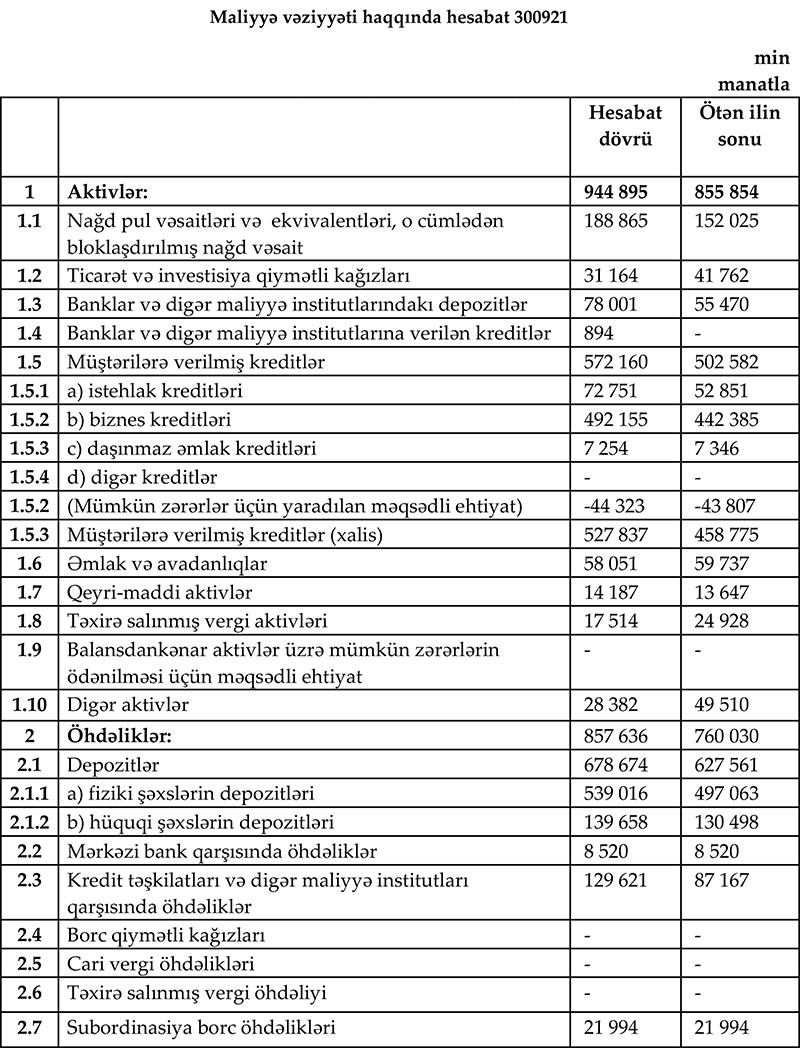 “AccessBank”ın cəmi aktivləri 2021-ci ilin 9 ayında ötən ilin sonu ilə müqayisədə 89 milyon 41 min manat və ya 10,4% artaraq 944 milyon 895 min manata yüksəlib.