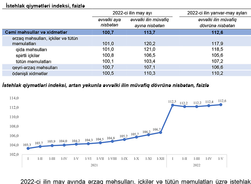 2022-ci ilin yanvar-may aylarında istehlak qiymətləri indeksi (inflyasiya göstəricisi) 2021-ci ilin yanvar-may aylarına nisbətən 12,6 faiz, o cümlədən ərzaq məhsulları, içkilər və tütün məmulatları üzrə 17,9 faiz, qeyri-ərzaq məhsulları üzrə 6,6 faiz, əhaliyə göstərilmiş ödənişli xidmətlər üzrə 10,2 faiz artıb.